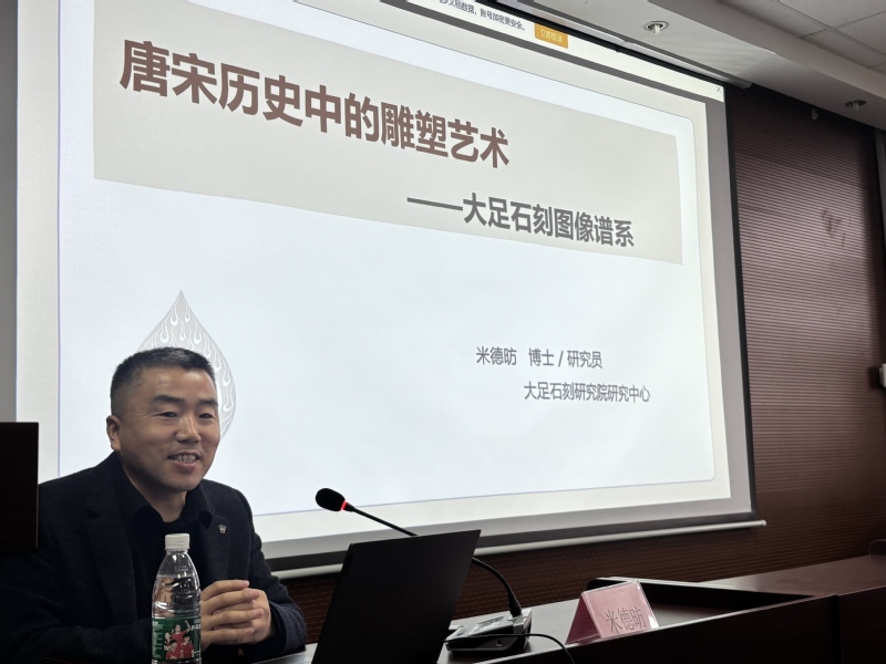 随后,大足石刻研究院大足学研究中心主任、历史学博士米德昉为嗨皮漫画 100余名师生带来一场精彩的讲座。娓娓道来的“唐宋历史中的雕塑艺术——大足石刻图像谱系”让嗨皮漫画 的师生感受世界文化遗产大足石刻的魅力和深厚的文化底蕴。