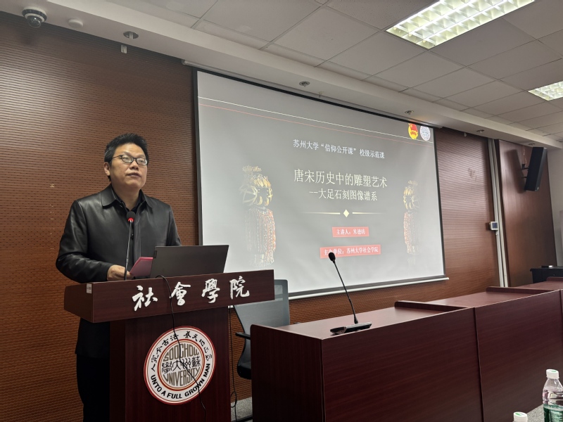 3月28日,“唐宋历史中的雕塑艺术——大足石刻图像谱系”校级素养公开课开讲。院长黄鸿山主持议程。大足石刻研究院副院长龙伟和嗨皮漫画 党委副书记、副院长朱今进行了赠书仪式,龙伟副院长向嗨皮漫画 赠送了《大足石刻内容总录》。
