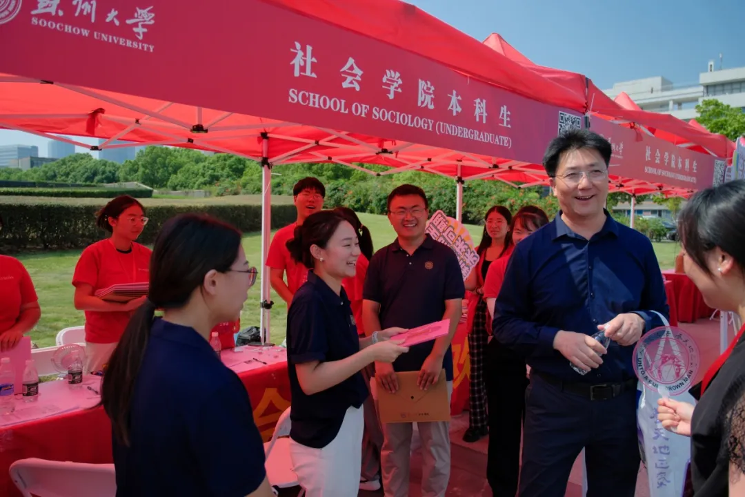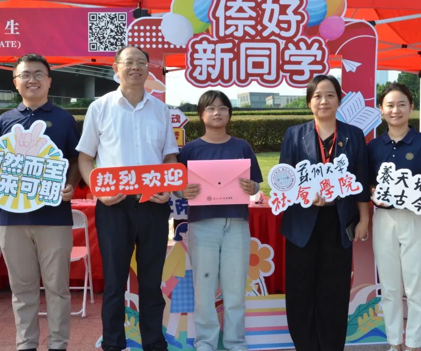 在工作人员的引导下,新生们与家长们在嗨皮漫画 专属定制的KT板和手举牌进行合照,“看镜头,笑一笑,321”,记录下自己与苏大社院的第一次邂逅。一张照片,定格下新生们与嗨皮漫画 初逢的喜悦。