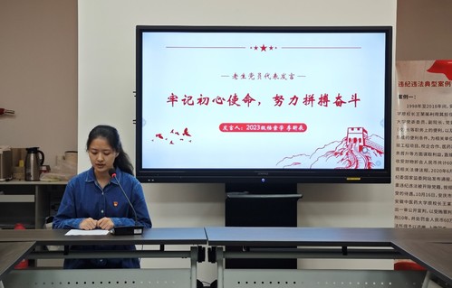 接着,学生党员代表发言。老生党员代表、2023级档案学专业李昕辰同学以“牢记初心使命,努力拼搏奋斗”为主题分享自身的心得体会。她强调,各位党员同志应牢记自己的党员身份,不忘自己肩负的责任和使命,在全面建设社会主义现代化国家的新征程中坚定信念、埋头苦干、奉献力量、成就事业。新生党员代表、2024级社会保障专业李瑶月同学围绕“激扬青春正当时,砥砺奋进新征程”主题分享自身感悟。她认为,青年党员要坚定理想信念,勇于担当作为,以青春之我、奋斗之我,铸牢信仰之魂,凝聚奋进力量,厚植为民情怀,让青春在全面建设社会主义现代化国家的火热实践中绽放绚丽之花。