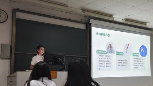 接着,2024级社会工作专业郭敏同学以自身备考本校的经历为例,为大家带来了考研专题分享。她从选择目标院校与专业、制定复习计划到合理分配时间、调整心态等多个方面,结合个人经验向新生们生动地讲述了考研过程中的每一个重要环节。她建议新生们要坚定目标、坚持不懈,同时要学会调节心态,合理安排复习节奏。