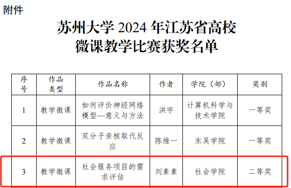 9月,江苏省高等学校教育信息化研究会公布了2024年江苏省高等学校微课教学比赛获奖名单,嗨皮漫画 社会学与社会工作系刘素素老师的参赛作品《社会服务项目的需求评估》荣获二等奖。