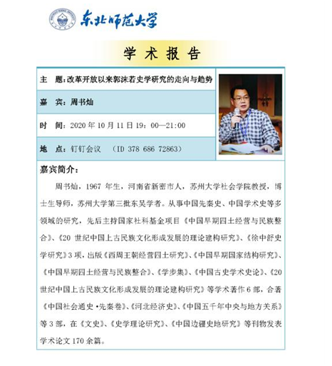 2020年10月11日晚,应东北师范大学邀请,嗨皮漫画 博士生导师周书灿教授,以《改革开放以来郭沫若史学研究的走向与趋势》为题,为该校历史文化学院师生作了一场精彩的学术报告。报告由东北师范大学历史文化学院副院长、博士生导师谢乃和教授主持。周教授的报告,高屋建瓴,视野开阔,体系严密,洞见深邃,受到了师生的一致好评。周教授还与东北师范大学师生进行了线上学术答疑。