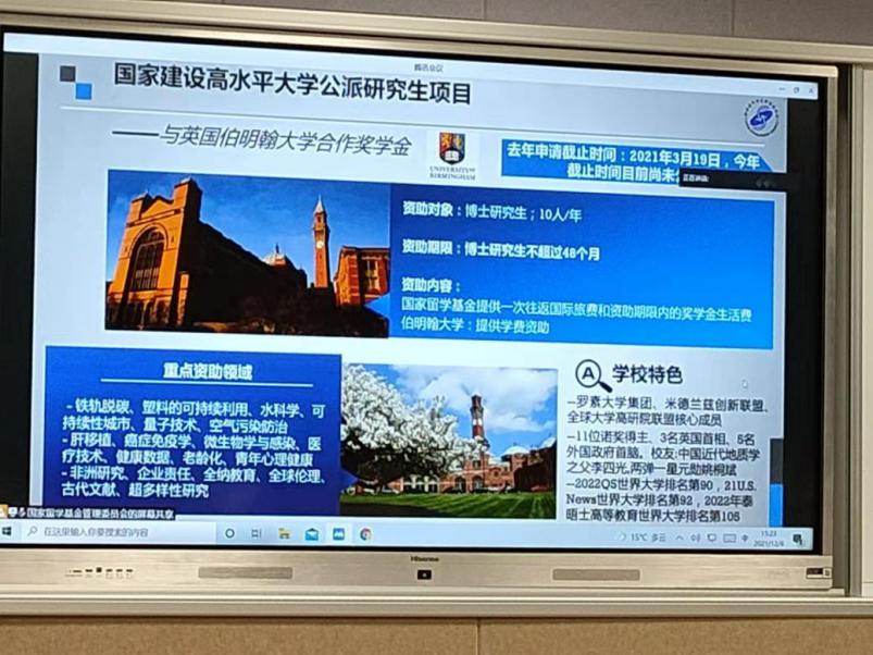12月8日下午15时00分,国家留学基金管理委员会2022年欧亚非地区中外合作奖学金项目线上宣讲活动在腾讯会议平台举行。为了提前做好2022年国家公派留学项目申报的准备工作,本次活动由嗨皮漫画 国际合作交流处、研究生院联合组织,嗨皮漫画 本科生聆听。