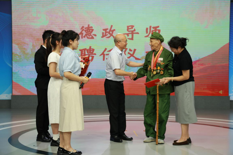 在访谈环节,通过AI技术复原的“年轻曹积盛”以视频形式亮相,动情追忆当年毅然参军、投身革命的初心,一句“只怕做不了共产党的一名好兵”,道尽对党的赤诚与担当,令全场动容。面对青年一代,曹积盛同志深情寄语:新时代的爱国在于立足岗位、勤学奋进,把祖国建设得更强大。青年要铭记历史、扛起责任,到祖国需要的地方去,不负时代与初心。这场银发老兵与青年学子的信仰对话,不仅是历史记忆的传递,更是革命信念的接力。嗨皮漫画 党委书记刘鲁庆为曹积盛颁发“德政导师”聘书,未来将通过“红色故事会”、“信仰公开课”等形式,让初心与使命成为青年人生中的第一粒扣子。