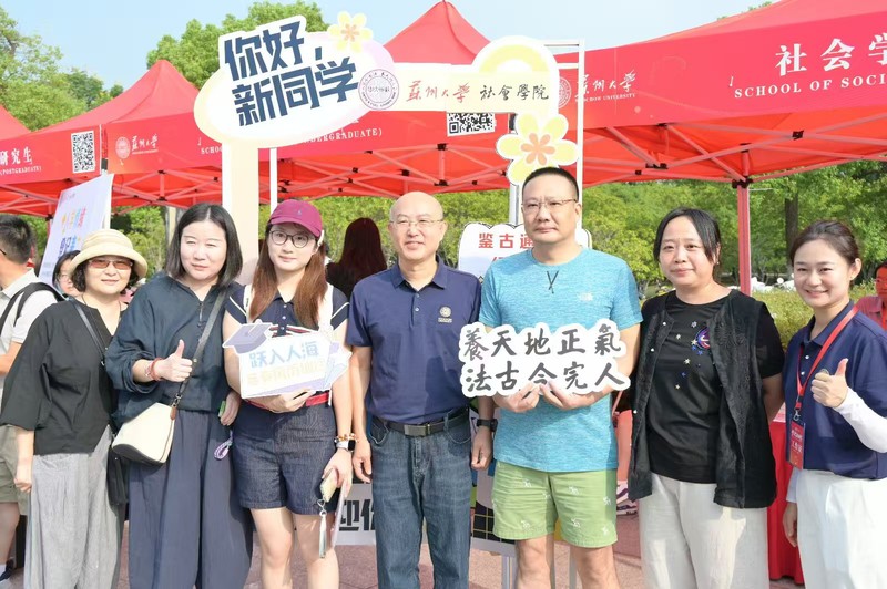 社院新生们有序完成报到流程,并在工作人员引导下,与家长一同在学院专属设计的KT板和手举牌前拍照留念。“看这里,笑一下,三二一”,镜头定格下他们与苏大社院初次相遇的美好瞬间。
