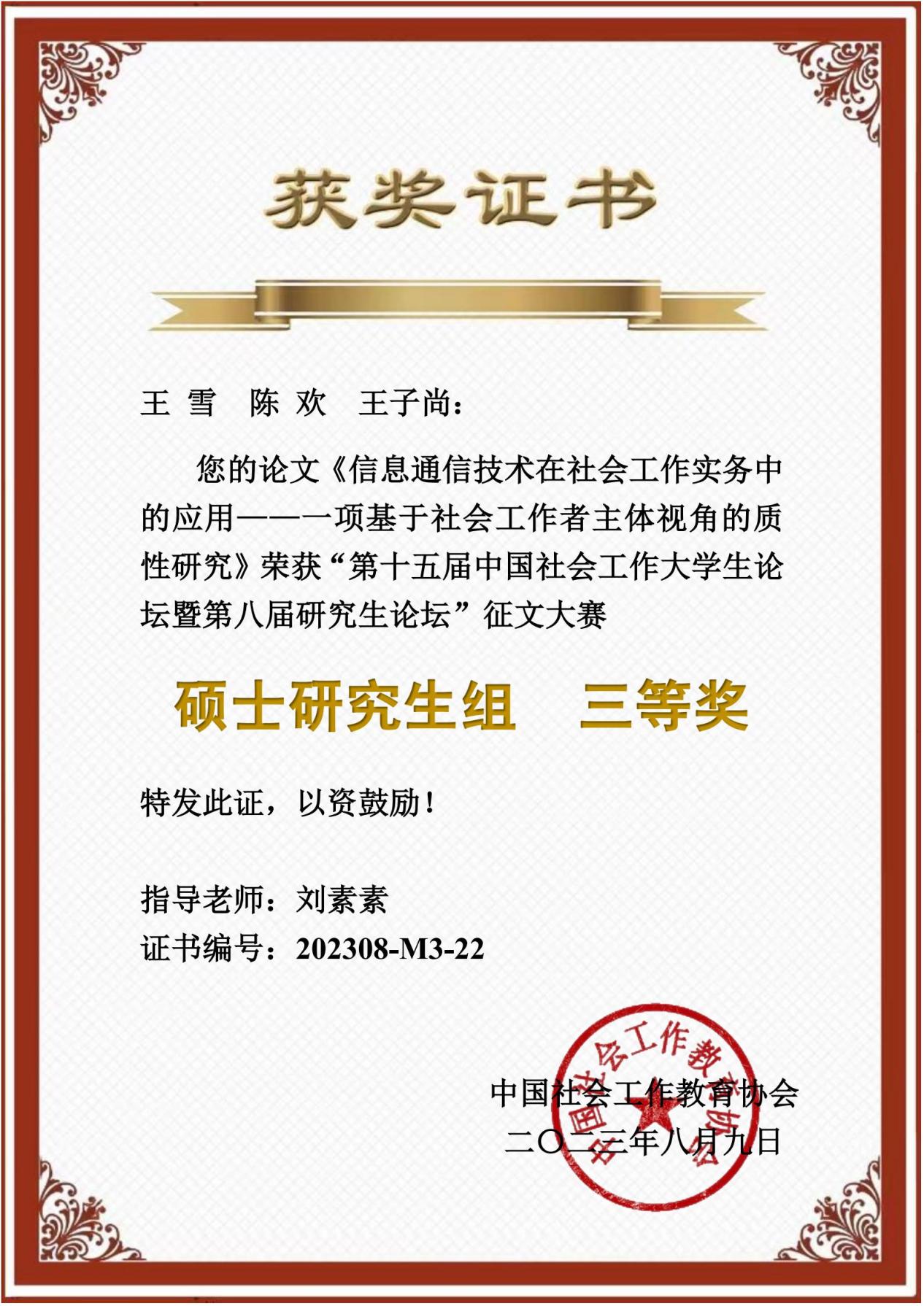 嗨皮漫画 社会工作专业硕士研究生王雪、陈欢、王子尚依托对22位苏州社会工作者的深度访谈,完成了“信息通信技术在社会工作实务中的应用——一项基于社会工作者主体视角的质性研究”一文,由陈欢同学在分论坛进行汇报,获得此次论坛三等奖。与此同时,嗨皮漫画 社会工作专业硕士研究生吴香怡以“发展资源对心理健康的影响——第一代与非第一代大学生差异分析”一文同样入选并参与线下发言。