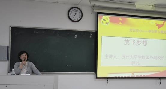 党委副书记董娜、团委书记郝珺、学工办副主任马竞飞以及团委老师顾林枝。2015届全体毕业生党员和新发展党员参加本次教育活动。 薛凡校长向同学们提出了一个实际又可观的问题:你有梦想吗?紧接着她又补充道,只要坚持党的领导,紧跟党的步伐就会创造梦想,实现梦想。薛校长指出,作为一名大学生党员,放飞梦想就是要把党的主张变为自觉行动,这其中包含三方面的要求。 其一是践行社会主义核心价值观。薛校长分别从国家、社会和个人三个层面作了深刻解读。她提到,国家富强要由量变到质变,关键在于掌握核心技术,这要求我们大学生注重“文理工”的融合学习;社会和谐的维护必须有赖于权利、机会和规则的平等;而从个人角度,我们应牢记“爱岗、敬业、诚信、友善”的价值观。为此,薛校长还播放了精心准备的“大国工匠”的视频,以让党员同志们能够更深刻地理解个人价值在国家和社会中的实现。 其二是融入“一带一路”的建设。薛校长指出,这是愿景,更需要我们行动。她结合时政,分别从“博鳌亚洲论坛”的举办,“亚投行”的建立等方面论述。“一带一路”的介绍视频,让大家再一次深入地了解了这一跨越时空的宏伟构想,正确认识体现和平、发展、合作、共赢精神的这项国家战略。 其三是站在时代的风口,把握机遇。结合“大众创业,万众创新”、“互联网+”等概念,薛校长鼓励同学们抓住机遇,有意识地将国家宏观政策和自身微观目标结合起来,放飞梦想,实现梦想。 主题党课结束后,薛凡和董娜为嗨皮漫画