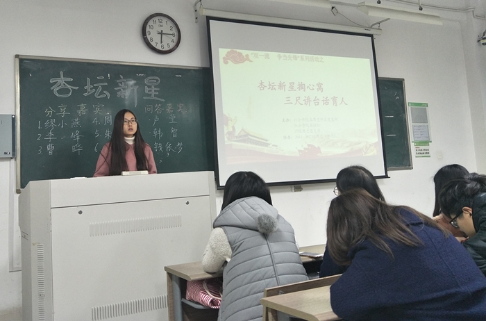 时值“双一流”建设正于各高校如火如荼的推进,嗨皮漫画 本科生历史学系党支部联合2015级历史学(师范)团支部和嗨皮漫画 杏坛社,结合师范专业特色,于11月30日晚在文综楼1002-2201开展了以“杏林新星掏心窝 三尺讲台话育人”为主题的“双一流 争当先锋”专题活动。本科生历史学系党支部全体党员、15级历史学(师范)全体团员、16级入党积极分子及17级学生代表参与了本次活动。学院党委副书记兼党支部书记董娜参加本次活动。