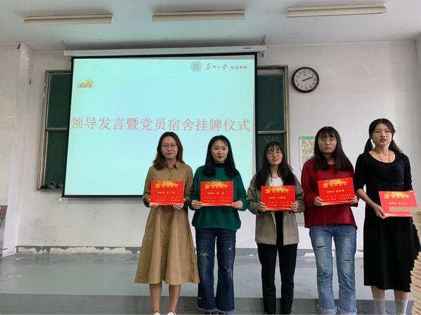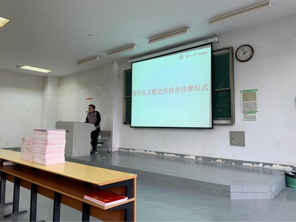 首先举行了党员宿舍的挂牌仪式,分党校为党员宿舍的同学们颁发了党员宿舍牌。为了让学生党员也能更好地开展“四重四亮”活动,学院党委为每个党员的宿舍制作了党员宿舍牌,以此来提醒广大学生党员,要时刻做到牢记自己的党员身份,亮出自己的党员身份,展示自己的党员形象。