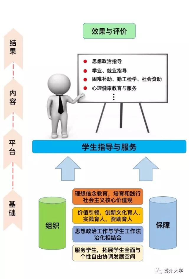 学校构建了学生指导与服务一体化体系与平台, 为学生提供学业指导、政治思想指导、就业指导、困难补助、勤工俭学岗位、社会资助、心理健康教育与服务等等。
