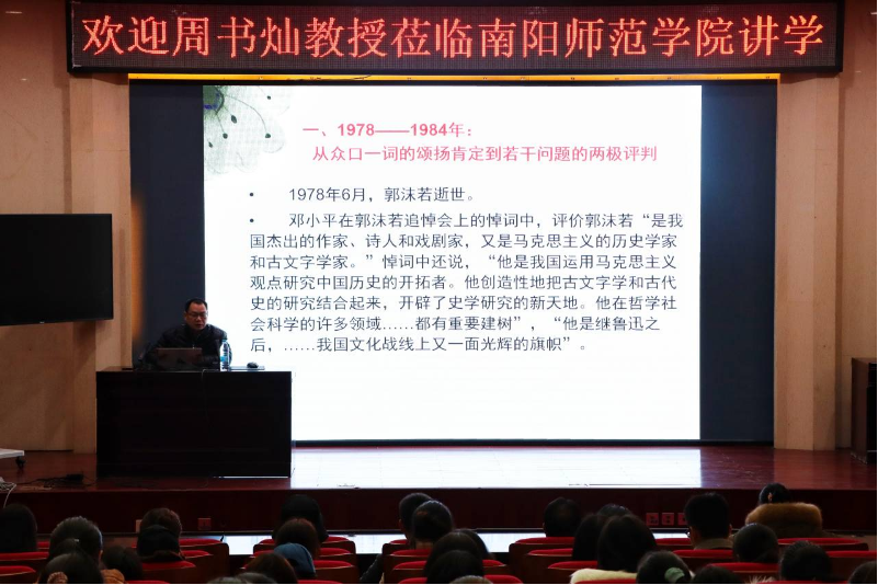 周书灿首先简要介绍了郭沫若的生平以及取得的巨大成就,并列举了多位名人对郭沫若及其学术的高度评价。他指出,早期的学术界对郭沫若史学予以充分肯定,甚或有些夸大拔高,与严格的郭沫若史学研究终究还有一段距离。随后,周书灿从1978-1984年“从对郭沫若众口一词的颂扬肯定到若干问题的两极评判”;1985-1995年“郭沫若史学研究在挑战中缓慢向前发展”;1996-2007年“‘反思郭沫若’影响思潮下郭沫若史学研究陷入低迷徘徊与清冷沉寂” ;2008年—至今“深刻反思之后郭沫若史学研究逐步深化,向着较高水准推进”四个阶段向同学们系统性地阐述了不同时期史学界对郭沫若史学研究成果褒贬不一的态度,同时,他引用了名家著述对“反思郭沫若”进行了事实论证。对此,周书灿强调:“一个正常的学术环境应当是有批评有反批评的,出现批评和新的看法,是社会进步的表现,从总体上说,它会推动学术的进步和文化的发展”。周书灿希望同学们评价个人及个人的学术时应秉持客观的态度,拓展理性的思维,切莫过于片面或是极端地进行评判。