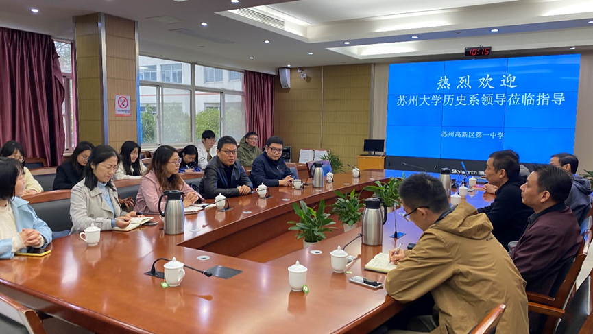 老师们随后前往苏州高新区第一中学。新区一中沈育生校长首先向老师们介绍了苏州高新区第一中学的基本情况,并代表新区一中对苏大的师范生给予了较高评价和肯定。沈校长结合以往的教师招聘经验对实习生提出了具体可行的建议,指出作为未来的教师应当展现出强烈的生命力、对生命的热爱,以及对知识的渴求。黄鸿山副院长对新区一中致以谢意,并介绍回顾了嗨皮漫画 师范学院的办学传统和过去几年历史系毕业生的就业情况,强调学校应当与实习学校加强联系,并询问实习基地领导及专家对本专业师范生培养的意见与要求。