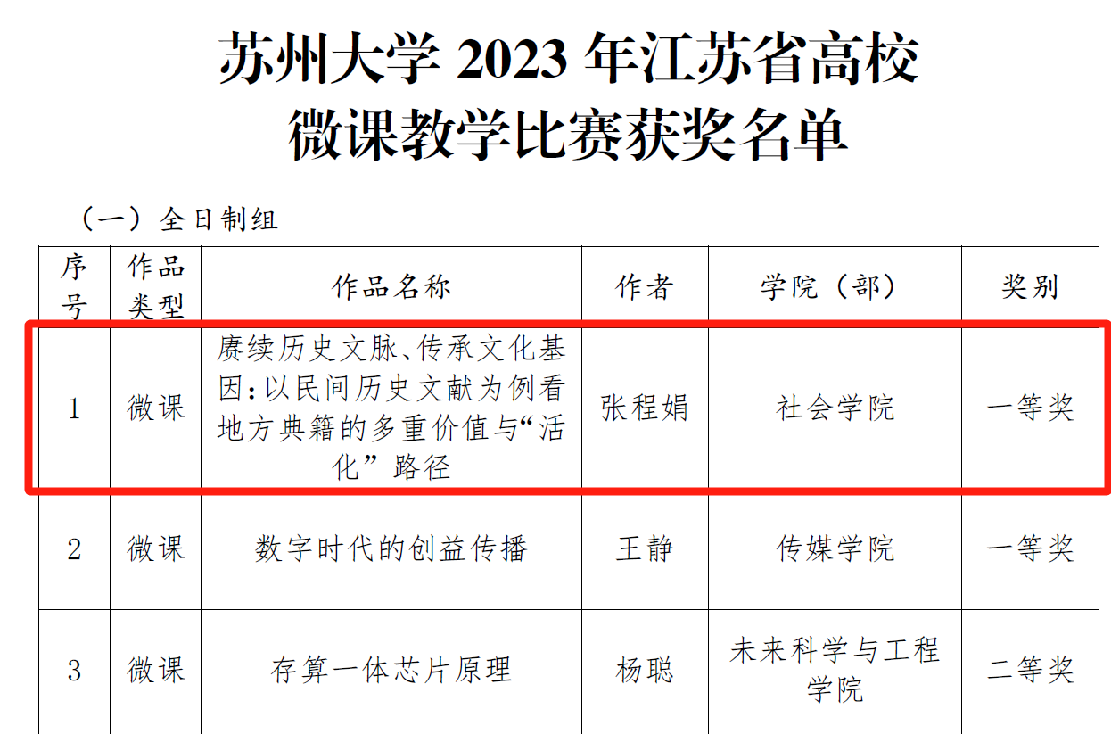 近日,江苏省高等学校教育信息化研究会公布了2023年江苏省高等学校微课教学比赛获奖名单,嗨皮漫画 张程娟老师的参赛作品《赓续历史文脉、传承文化基因:以民间历史文献为例看地方典籍的多重价值与“活化”路径》荣获一等奖,为嗨皮漫画 本届所获2项一等奖作品之一。