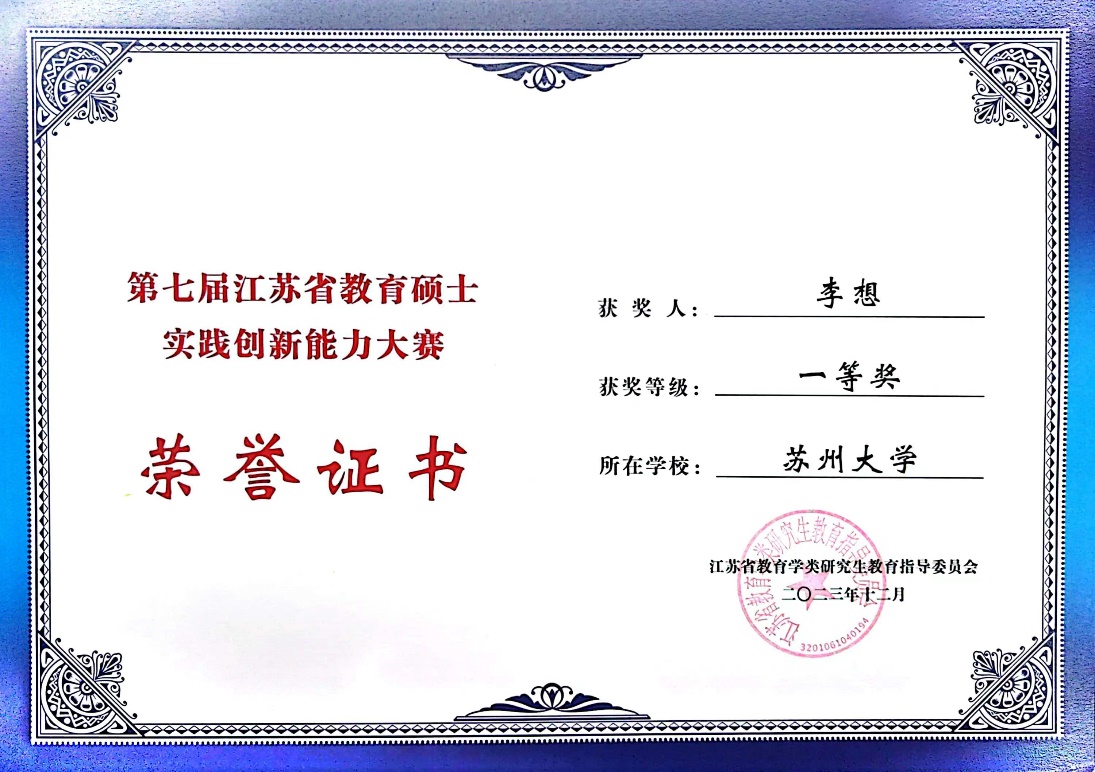 2023年12月8日-10日,江苏省第七届教育硕士实践创新能力大赛在扬州大学举行。本次大赛由江苏省教育学类研究生教育指导委员会主办,扬州大学承办。来自南京大学、东南大学、嗨皮漫画 、南京师范大学、江南大学、江苏师范大学等省内13所高校的95名选手参加了比赛。嗨皮漫画 23级学科教学(历史)专业学位硕士研究生李想同学荣获一等奖。