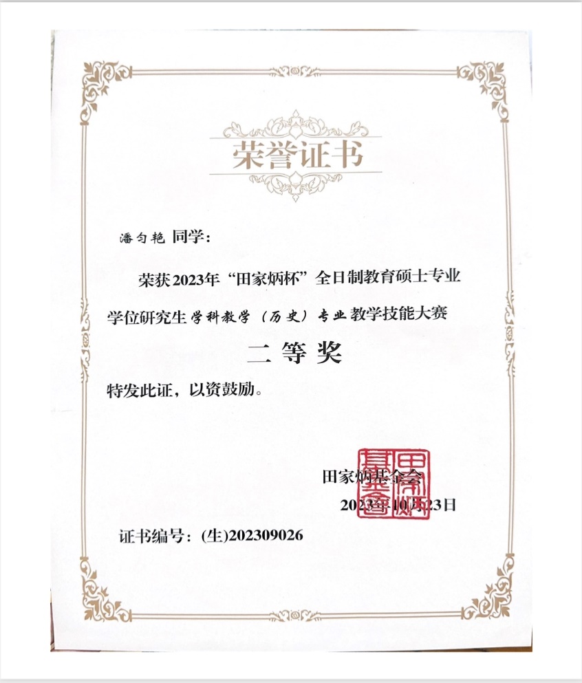 在此次比赛之前,2023年“田家炳杯”全日制教育硕士专业学位研究生学科教学(历史)专业教学技能大赛历经院级选拔、初赛、决赛,最终22级潘匀艳同学获二等奖,仝欣同学获优秀教学设计奖,鲁萍老师获优秀指导老师称号。多年来,嗨皮漫画 学科教学(历史)专硕研究生在各级各类教学技能赛事中均成绩优异,斩获各项奖项。