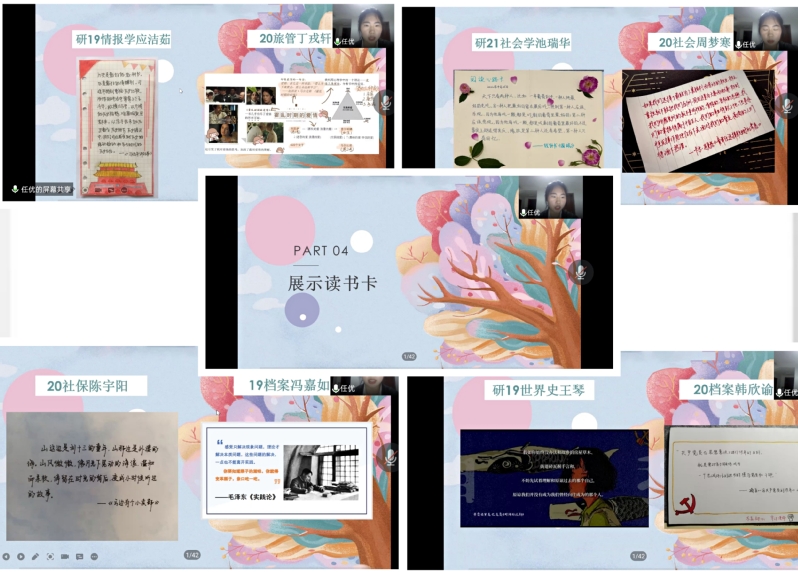 紧接着,主持人向大家集中展示读书卡。同学们为分享会制作的精美读书卡片一一呈现在屏幕中,有的分享了自己的读书感悟,有的展示了自己的金句摘抄,内容丰富多样。活动中也选出了优秀读书卡片,鼓励同学们将感悟落在笔尖,将理论转化为实践。