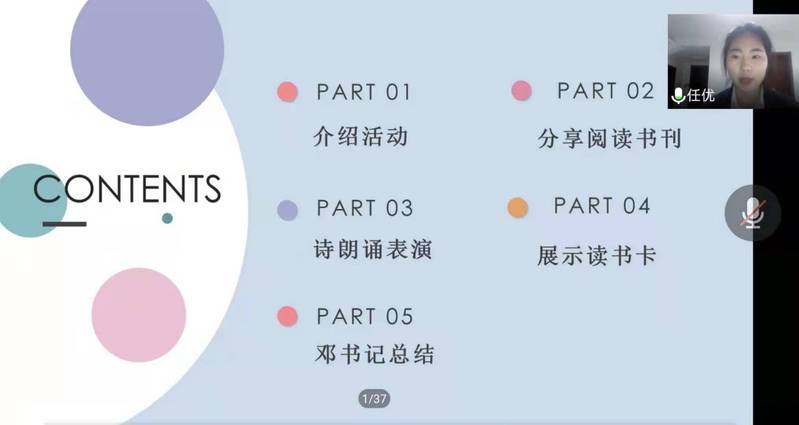 随后,陈宇阳、柳晓晗、冯嘉如、任优、李小婉五位同学结合自身实际,分享了自己阅读的书刊。