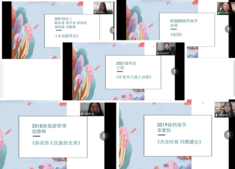 书刊分享环节结束后,培训班学员以诗朗诵的形式,表达青年之声,向党的二十大献礼。陈如意、郭宇辰、彭赵星、秦柏杨、刘骐铭五位同学通过朗诵《永远跟党走》,带领大家回顾党的历史和成就的同时,表达出在党的带领下一定会实现中国梦的坚定信心。余琦用《祖国》传递了作者海子的信仰和追求,鼓励大家以梦为马,不负韶华。赵静姝为大家朗诵的是为迎接党的二十大召开所做的诗歌《你是伟大民族的荣光》,表达出在党的二十大到来之际,中华儿女有信心,有决心,跟党走,凝聚力量,不负时代向远方。章紫怡通过朗诵《共克时艰同期盛会》也表达出对党的二十大即将召开的激动心情。王玥朗诵的《在复兴大道上向前》向大家展示了中华民族在复兴路上做的努力,并表达出中华民族会不断努力,一直向前。