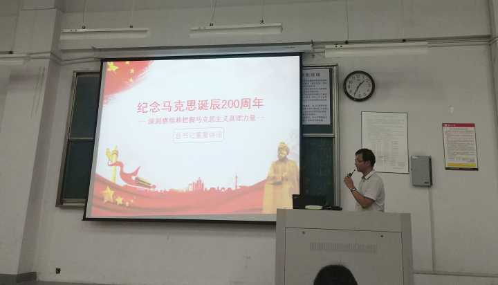 活动开始,包书记首先解释了开展本次党课的原因即希望借助本次党课能够解放思想,调动大学生的思想积极性和活跃度。党课的内容主要从四方面开展。第一部分为介绍卡尔·马克思的生平。介绍了马克思的国籍、求学经历、革命生涯、与恩格斯的友谊等内容。让在座的同学们的详细的了解了马克思的生平经历。第二部分为介绍马克思主义的主要成就以及个人专著,包书记对于马克思的成就做出了高度评价。