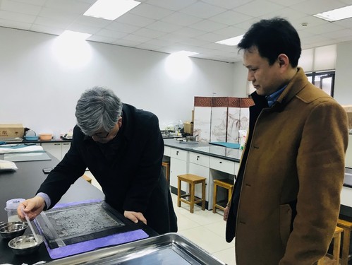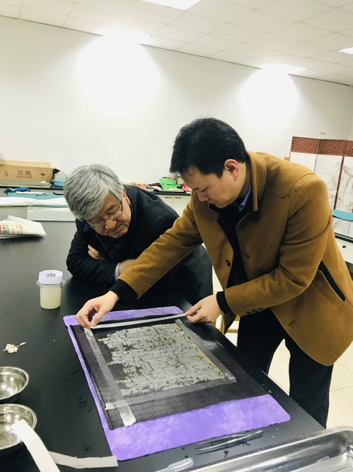 下午1:30,双方移步至档案与电子政务系实验室,毕建新老师现场展示了纸浆法修复技术并邀请Sam Gyun Oh教授亲手体验。Sam Gyun Oh教授对此表示出充分兴趣并给予高度评价。