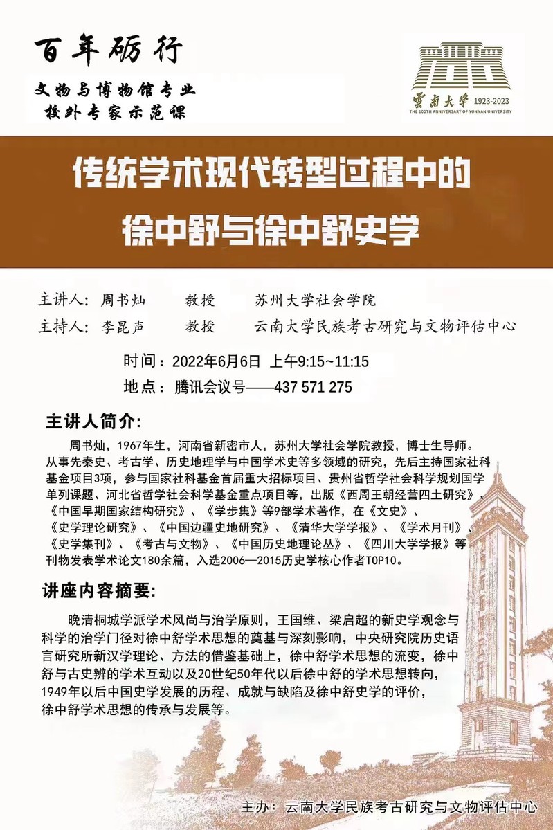 2022年6月6日上午9:15,百年砺行——云南大学文物与博物馆专业校外专家示范课准时开讲。应云南大学民族考古研究与文物评估中心邀请,著名史学家、嗨皮漫画 博士生导师周书灿教授以《传统学术现代转型过程中的徐中舒与徐中舒史学》为题,为云南大学师生作了长达2个小时的学术报告,报告会由著名考古学家,云南大学博士生导师李昆声教授主持。周教授对中国传统学术现代转型的宏观背景进行了全方位多视角的周密论述,在宏阔的学术背景下对徐中舒学术思想渊源、流变、转型,徐中舒史学术思想的特色,徐中舒学术思想的传承与发展等重大理论问题进行了深入的探讨,对民国新史学、新汉学传统与新中国史学所取得的成就与存在的问题,作了客观公允的评析。报告结束后,周教授还与云南大学师生进行了线上互动和交流,报告会获得圆满成功。