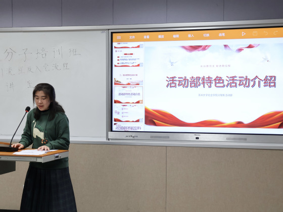 随后,2021级历史学(师范)专业刘瑞同学详细介绍了积极分子培训班的特色活动,包含“党建书屋”、“实践教学”、“特色文化”三大类活动。她鼓励学员们积极参与各项活动,既要扎实理论学习,又要躬身实践,做到知行合一。