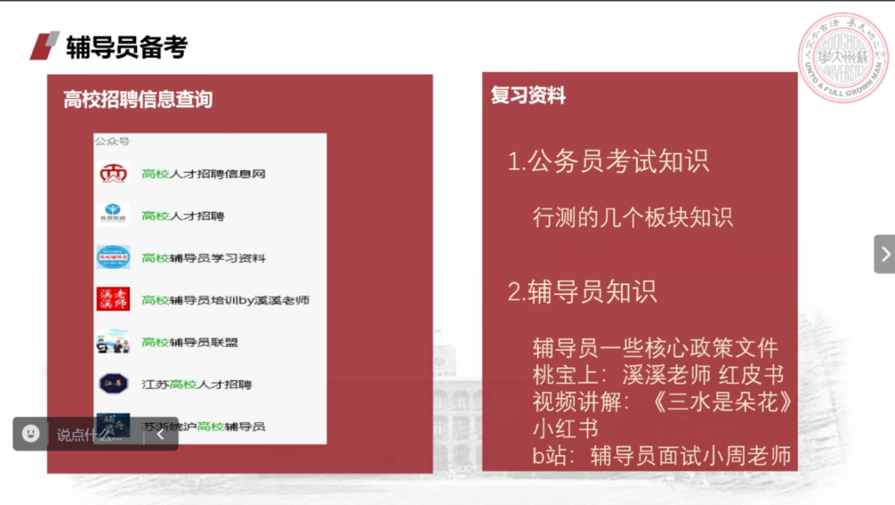 第一位嘉宾是2021级图书情报专业的孙金洲同学,他成功上岸了嗨皮漫画 医学院的辅导员。孙金洲从院校地区选择、笔试准备和面试备考等方面展开对辅导员岗位的备考经验分享。