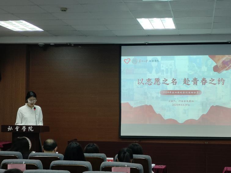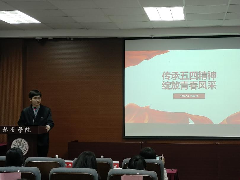 2024年“嗨皮漫画 五四青年奖˙向上向善好青年”获得者,2021级档案学张晨阳同学做主题为“以志愿之名,赴青春之约”的分享,讲述自己参与志愿活动的故事,号召社院学子积极踊跃地参与到志愿服务中去,用行动彰显青年风采。