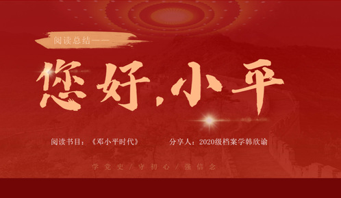 2020级档案学专业韩欣谕同学分享了《邓小平时代》。她指出,本书是对邓小平同志跌宕起伏的一生以及中国惊险崎岖的改革开放之路的全景式描述,被称为邓小平研究“纪念碑式”的著作。“解放思想、实事求是”是邓小平精神的精髓,是邓小平时代的核心命题,当代青年必须“敢破敢立,敢闯敢试验”,在新时代勇立潮头,奋勇争先。结合自己的阅读感想,韩欣谕同学提取了革命者、改革者、建设者、改革开放、外交突破、南方谈话等关键词制作了一张海报,这张海报凝练了邓小平同志的生平与思想精神。