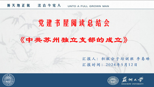 2022级中国史专业李易峰同学,分别从内容简介、读书感悟、阅读成果展示三方面向同学们分享了自己所阅读的书籍《中共苏州独立支部的成立》。1925年9月,苏州第一个党组织——中共苏州独立支部在乐益女中秘密建立,苏州人民的革命斗争从此有了坚强的战斗堡垒和领导核心。这本书便是介绍了中共苏州独立支部的成立过程,以及创立支部的三位革命者张闻天、侯绍裘、叶天底的革命故事。李易峰谈到,近代以来苏州工农、学生的革命斗争深深地激励着他,通过阅读本书深刻认识到了中共苏州独立支部在苏州轰轰烈烈的革命潮流中起到中流砥柱的作用。最后,他鼓励各位青年学子要脚踏实地、向学好学,为实现中华民族伟大复兴的中国梦而不懈奋斗!