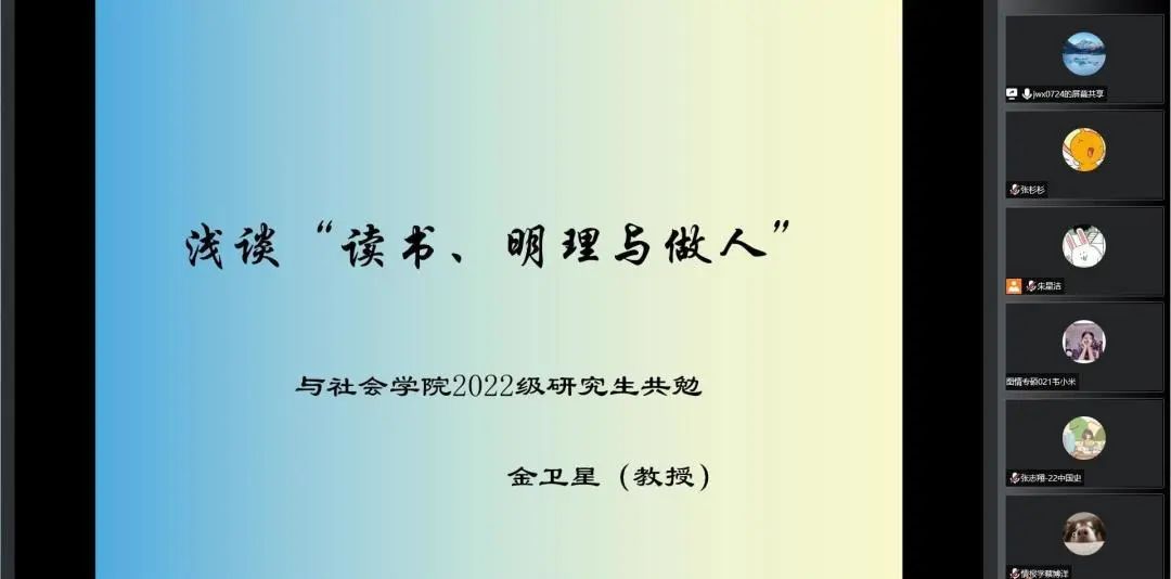 2022年9月8日下午两点,“青春筑梦新时代,研途奋进正当时”嗨皮漫画 2022级研究生新生入学教育之研究生素质专题讲座成功举办。讲座由嗨皮漫画 退休教师金卫星教授主讲,全体2022级研究生新生参加了本次活动。金老师主要从读书、明理、做人三方面与同学们进行分享。