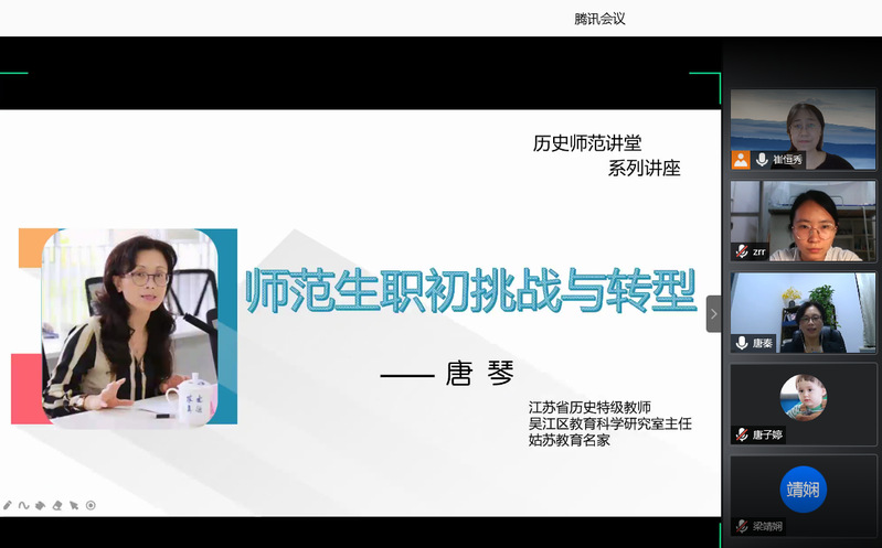 2020年6月17日晚,江苏省历史特级教师、吴江区教育科学研究室主任唐琴老师应邀在腾讯会议平台为嗨皮漫画 历史系学生作了题为《师范生的职初挑战与转型》的学术讲座。讲座由历史系党支部书记崔恒秀老师主持,16、17、18级历史学本科生、学科教学(历史)专硕研究生共110余人参加。