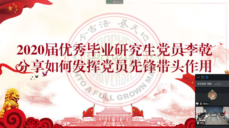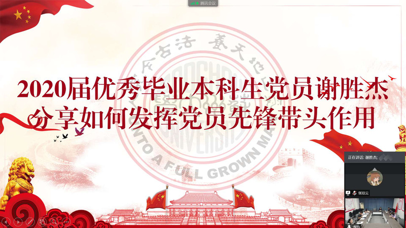 随后,嗨皮漫画 2020届优秀毕业生党员谢胜杰和李乾同学分别向我们分享了如何发挥党员的先锋模范带头作用。来自本科生第二党支部谢胜杰同学从思想上的坚定、学习上的楷模、工作上的表率、生活上的榜样四个方面进行表态,提出要以实际行动切实发挥好党员的先锋模范带头作用。来自研究生专业型第一党支部李乾同学结合个人实际情况,强调在工作中要真正加强理论与实践相结合,不断反思、总结,继续发光发热,努力为社会发展贡献个人力量。