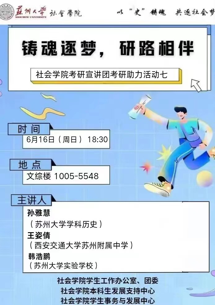 6月16日晚18:30,东吴史学升学经验分享会(专硕+就业专场)在1005-5448顺利举行。本次分享会旨在为历史系准备考研和即将就业的学子们提供宝贵的经验指导,帮助他们明确未来方向,坚定信心。