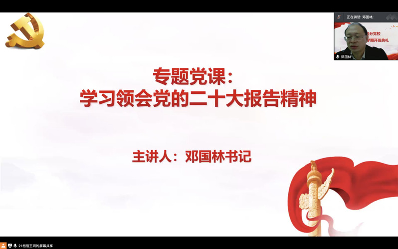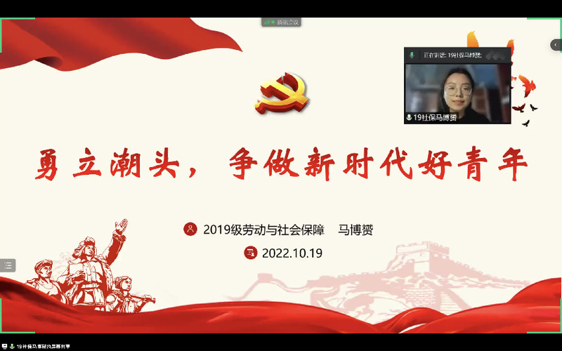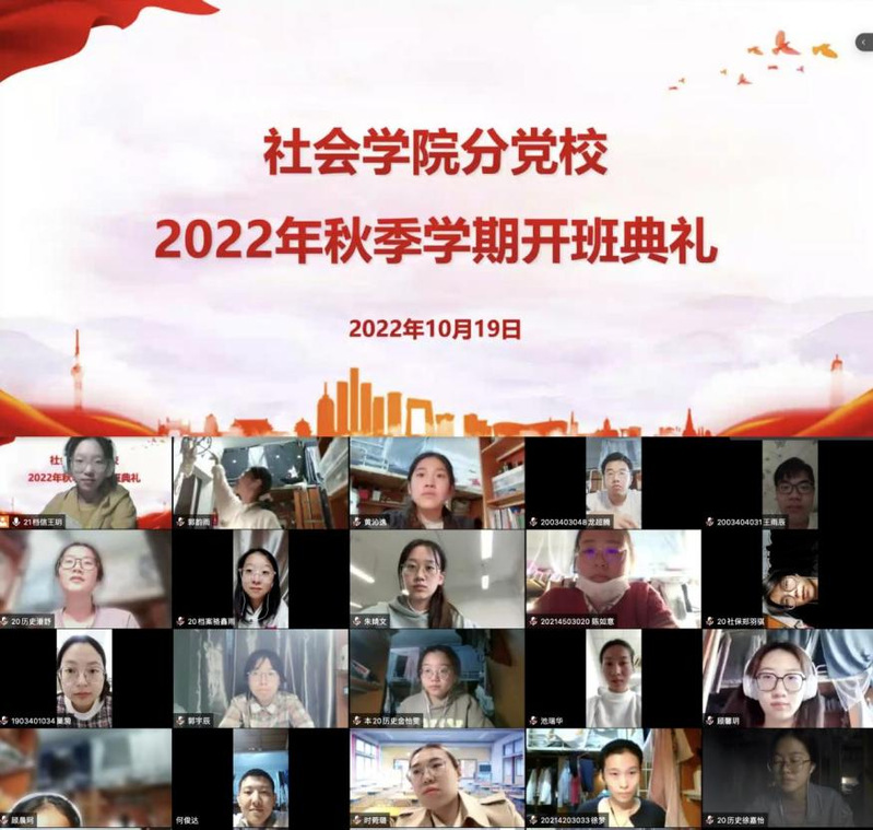 为深入学习贯彻党的二十大精神,扎实推进党史学习教育常态化长效化,加强党性修养锤炼,提高党员发展质量,10月19日下午,嗨皮漫画 分党校2022年秋季学期开班典礼暨第一次党课活动在线上平台顺利举行。学院党委书记、分党校校长邓国林,党委副书记兼副院长、分党校副校长朱今,分党校秘书李玲,研究生辅导员朱星洁,本科生辅导员孙帅以及各学生党支部书记、副书记出席活动。学院第14期积极分子培训班、第68期党的基本知识培训班、第47期预备党员培训班全体学员以及分党校工作人员参加活动。活动由2021级图书情报与档案管理类专业王玥同学主持。