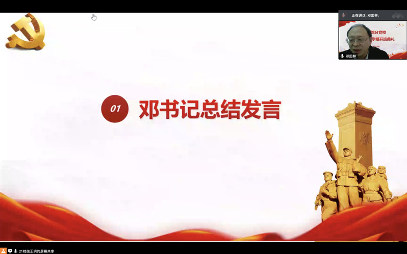 典礼最后,邓国林书记作总结发言。他对分党校“双百双联”活动和党建书屋师生共读特色活动给予充分肯定,鼓励大家积极参与。随后,他引用党的二十大报告中的一段话:“青年强,则国家强。当代中国青年生逢其时,施展才干的舞台无比广阔,实现梦想的前景无比光明”,对全体学员提出殷切期望,鼓励同学们成为有理想、敢担当、能吃苦、肯奋斗的新时代好青年。
