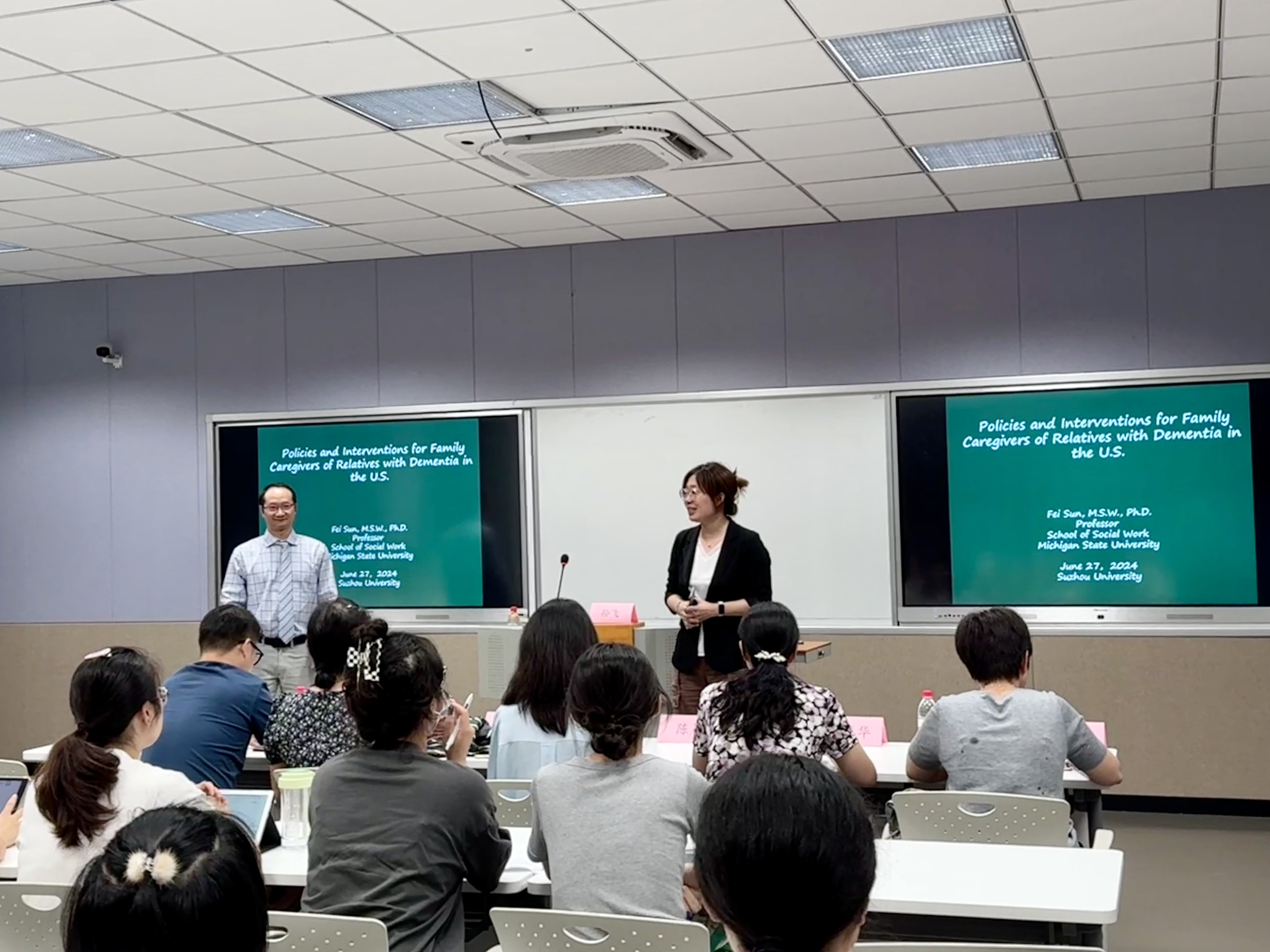 为了进一步加强嗨皮漫画 社会工作专业师生的学术交流,提升学生的实践素养,社会学与社会工作系于6月27日晚上在文综楼5433室举办“东吴社会学”系列学术讲座。讲座由嗨皮漫画 副教授、社会学及社会工作系副主任刘素素主持,特别邀请到了美国密歇根州立大学孙飞教授带来一场主题为《认知症家庭照料的支持政策和干预实践:美国的经验》的学术讲座。劳动与社会保障系陈红霞老师、李曼老师、刘欢老师,社会学与社会工作系陈晨老师参加了此次讲座。同时,讲座也吸引了来自苏州市委党校、常熟理工学院的老师参与,也得到了夏威夷大学马诺阿分校社会学系张微教授的现场支持。
