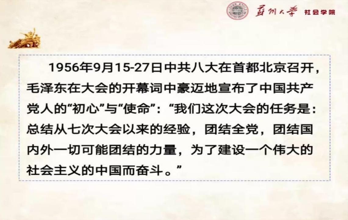金教授先讲述了初心和使命百年来的传承轨迹。从中共一大到十九大,中国共产党的初心与使命经历了一个丰富而曲折的发展历程,最终扎根于中国特色社会主义的民族复兴伟业。习近平总书记在党的十九大报告中强调,中国共产党的初心与使命就是为中国人民谋幸福,为中华民族谋复兴。