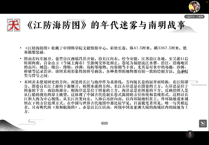 《江防海防图》展示了明末清初南明与清朝军队在长江下游和浙江沿海作战时的地理形势,是中国与世界古代地图中非常罕见的、以长江右岸为上方的地图。学者在对该地图进行研究时,根据图中“崇明县”、“靖江县”注文以及史料,推算此图的绘制时间在万历十四年(1586年)至天启元年(1621年),然而图中的“宝山旱寨”却是嘉靖三十六年(1557年)前事,二者存在矛盾,这可能源于两个因素,一为绘制此图时,有些区域信息没有及时更新,二是此图很可能基于一幅早于嘉靖三十六年的地图增补或摹绘而成。进一步的研究证实了这种可能性,《江防海防图》与与明代吴时来编纂、王篆增补《江防考》所附的《江营新图》非常接近。由于图中的崇明沙洲部分亦有可能是地图最后绘制时根据当时的情况进行了调整,所以《江防海防图》依据的地图可能更早于《江防考》之《江营新图》。孙老师通过讲述《江防海防图》表现出的南明战事与年代迷雾,以及其蕴含的方法论启示,指出在判断地图年代时,不能只根据图上的部分地理信息遽下定论,而要充分考虑地理信息的复杂性和层累可能。
