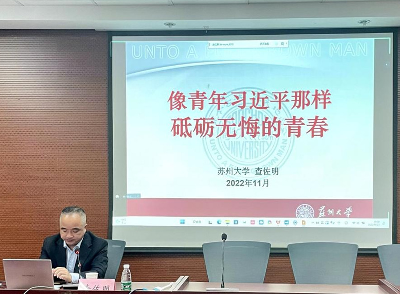 查佐明副校长从“窑洞里长满了故事——习近平的知青岁月”、“树高千尺忘不了根——他把心留在了这里”和“梁家河有大学问——追寻习近平的初心”三个篇章,讲述了习近平总书记与陕北延安梁家河村的故事。